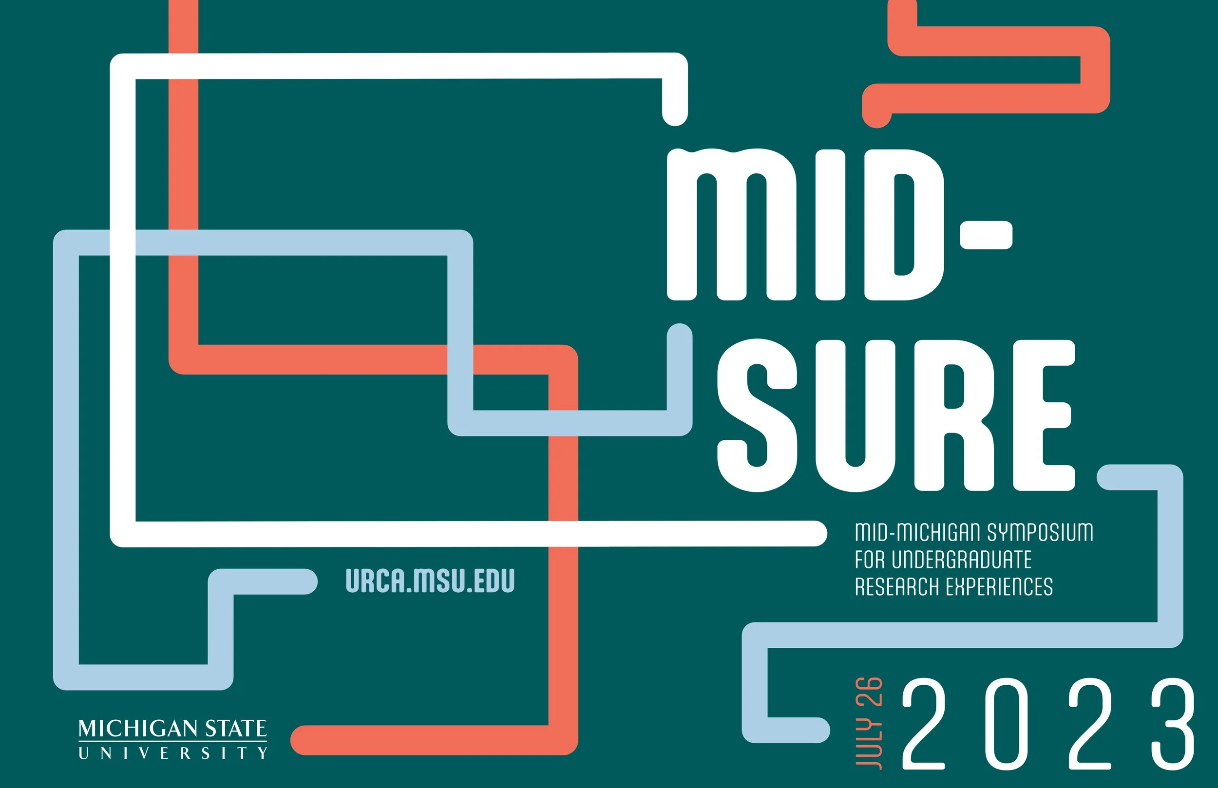 This design illustrates how research can spread, overlap, intersect, and take different paths. Each line stems from or meets with the word “Mid-Sure” because this event allows students to share their work and have it spread and circulate to a larger audience. These lines also exit the page dimensions to illustrate how the people and research included in this catalog come from all over and extend beyond the East Lansing area and Michigan State University community.
