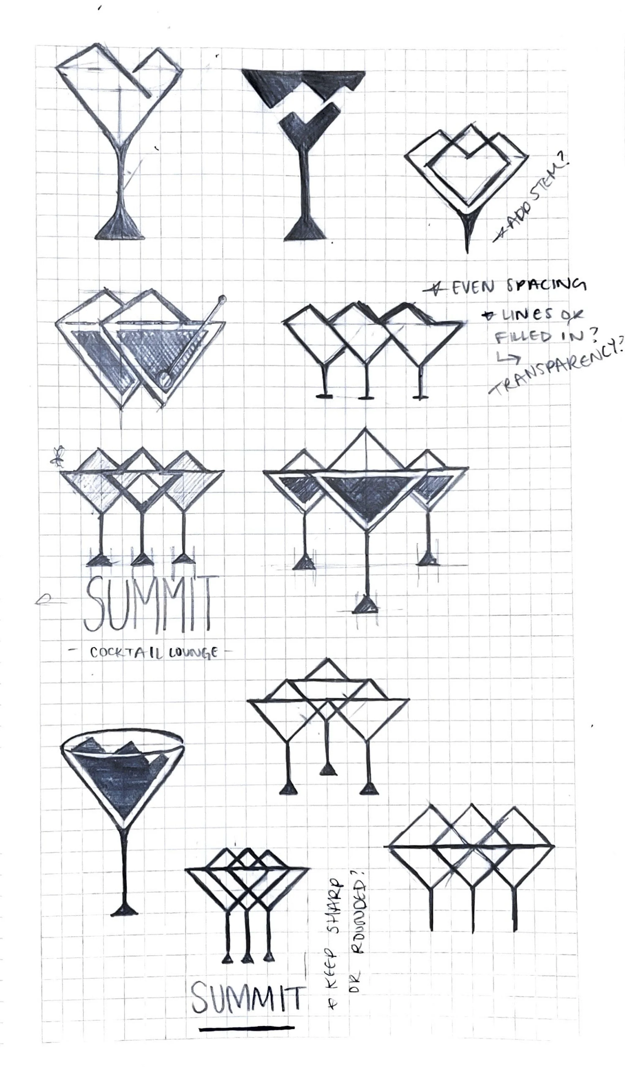 The main goal of the Summit logo was to capture the essence of the mountain aesthetic and the cocktail lounge atmosphere. The illustration combines a mountain landscape and martini glass to pull the two elements of the location together clearly and effectively. Summit Cocktail Lounge has a cozy yet upscale atmosphere, and the logo communicates that through its concise, minimalistic design that remains welcoming. The brand name is in the font Oriya Bold, which helps solidify the more luxurious nature of the location through its unique visual features.
